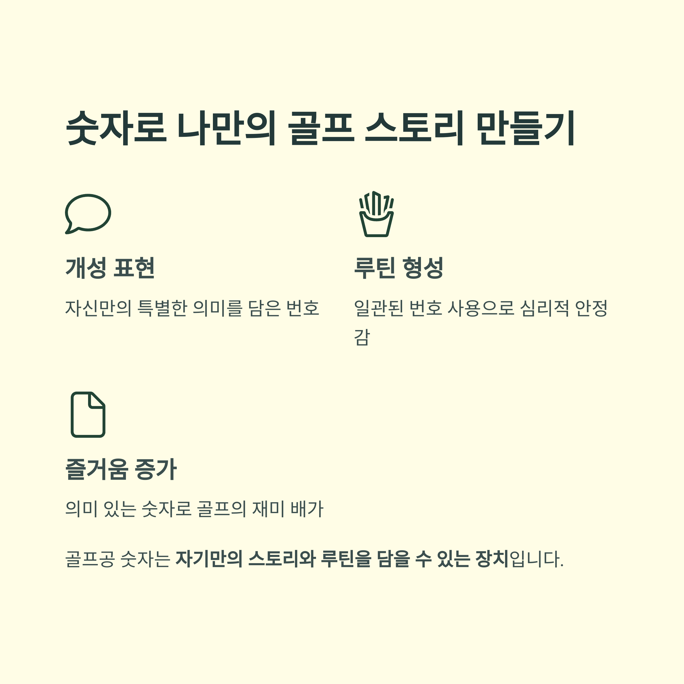 골프공의 숫자는 단순한 장식이 아닌, 자기만의 스토리와 루틴을 담을 수 있는 장치입니다.