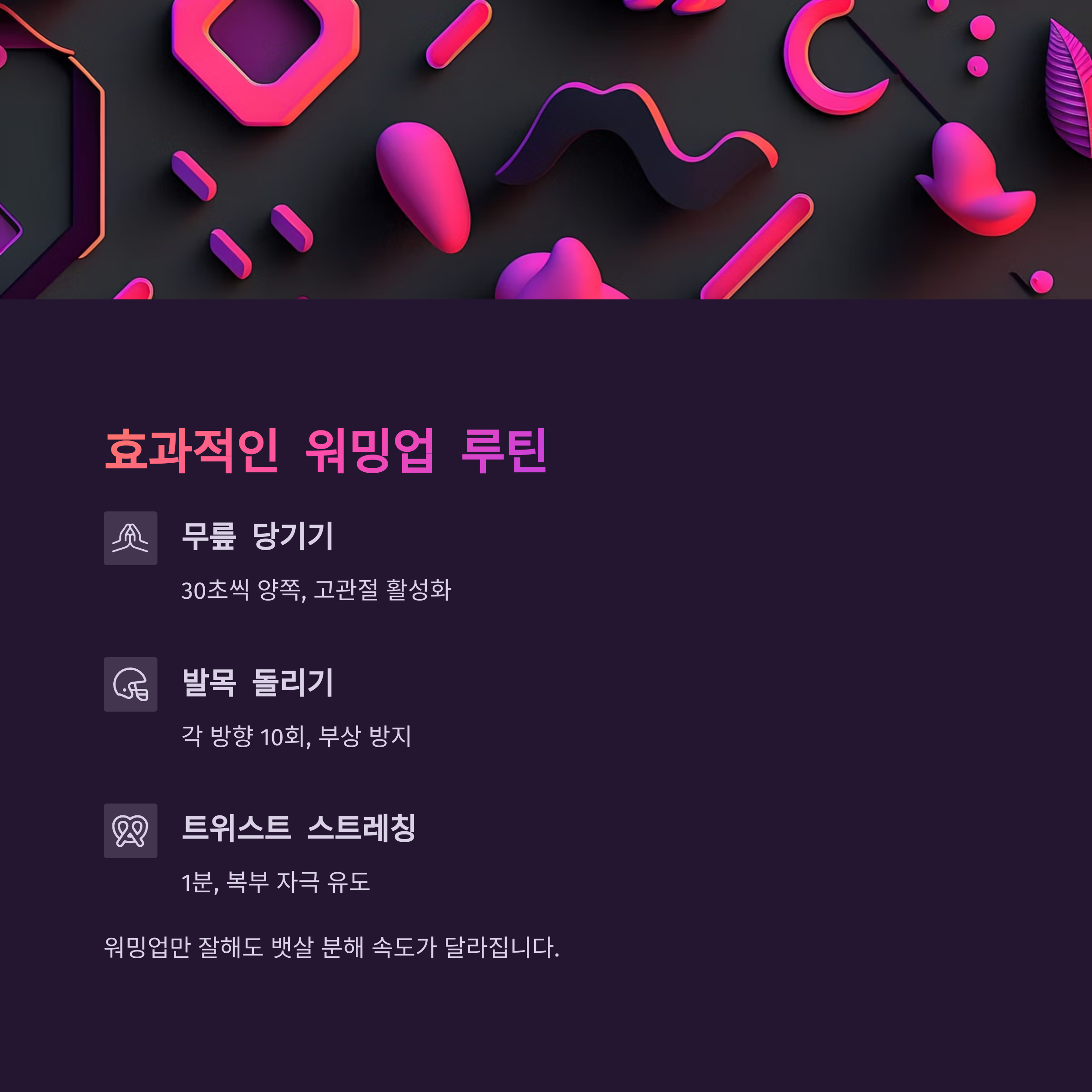 중요한 건 규칙성이며, 몸 상태에 따라 편한 시간대에 지속하는 것이 핵심입니다.