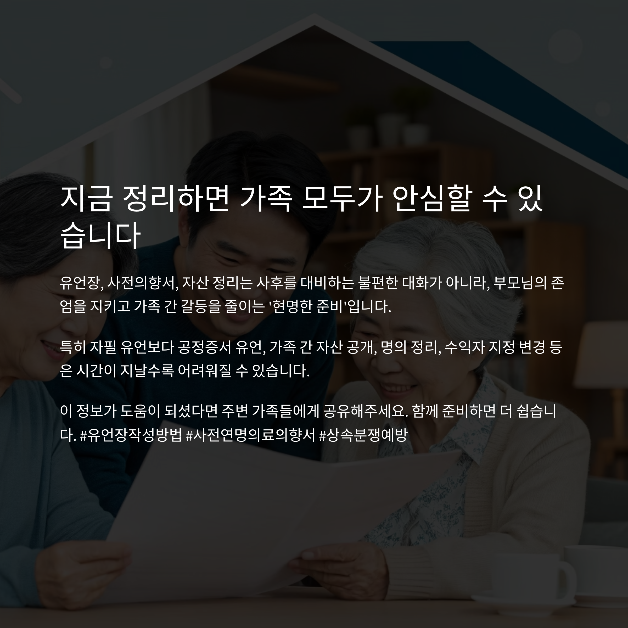 ‘현명한 준비’입니다. 특히 자필 유언보다 공정증서 유언, 가족 간 자산 공개, 명의 정리, 수익자 지정 변경 등은 시간이 지날수록