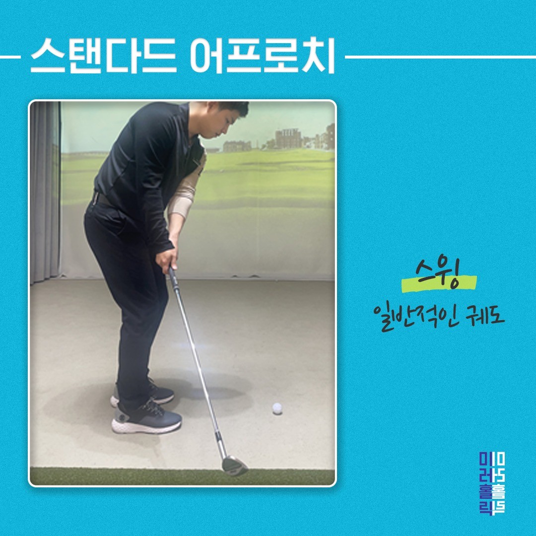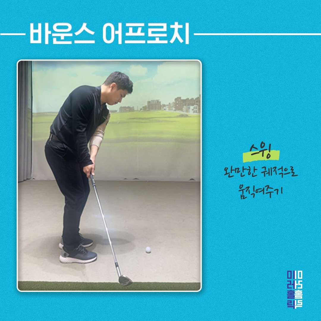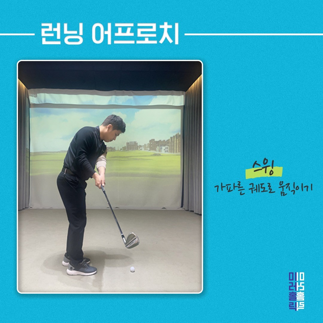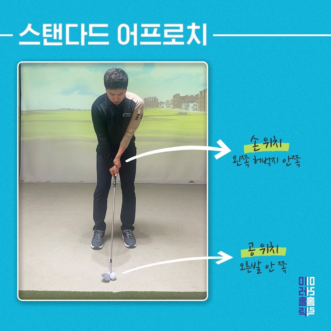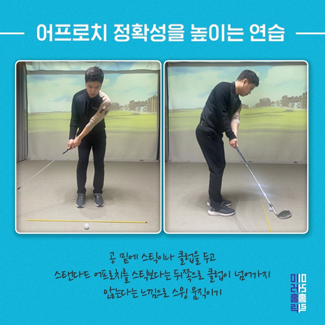 공 밑에 스틱이나 클럽을 두고 스탠다드 어프로치를 스틱보다 뒷쪽으로 클럽이 넘어가지 않는다는 느낌으로 스윙 움직이기