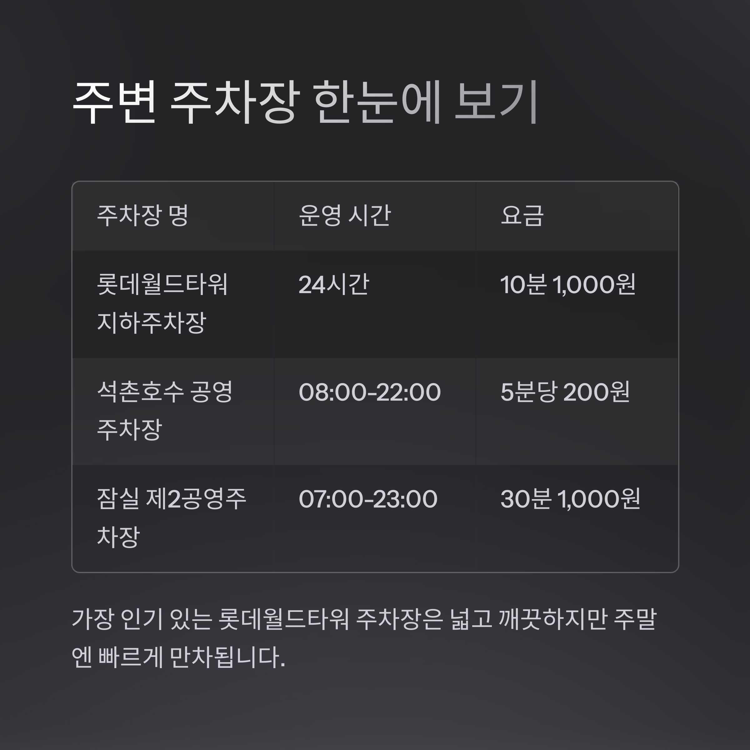 | 롯데월드타워 지하주차장 | 석촌호수 서쪽 | 24시간 | 기본 10분 1,000원 | 자리 넉넉함 |