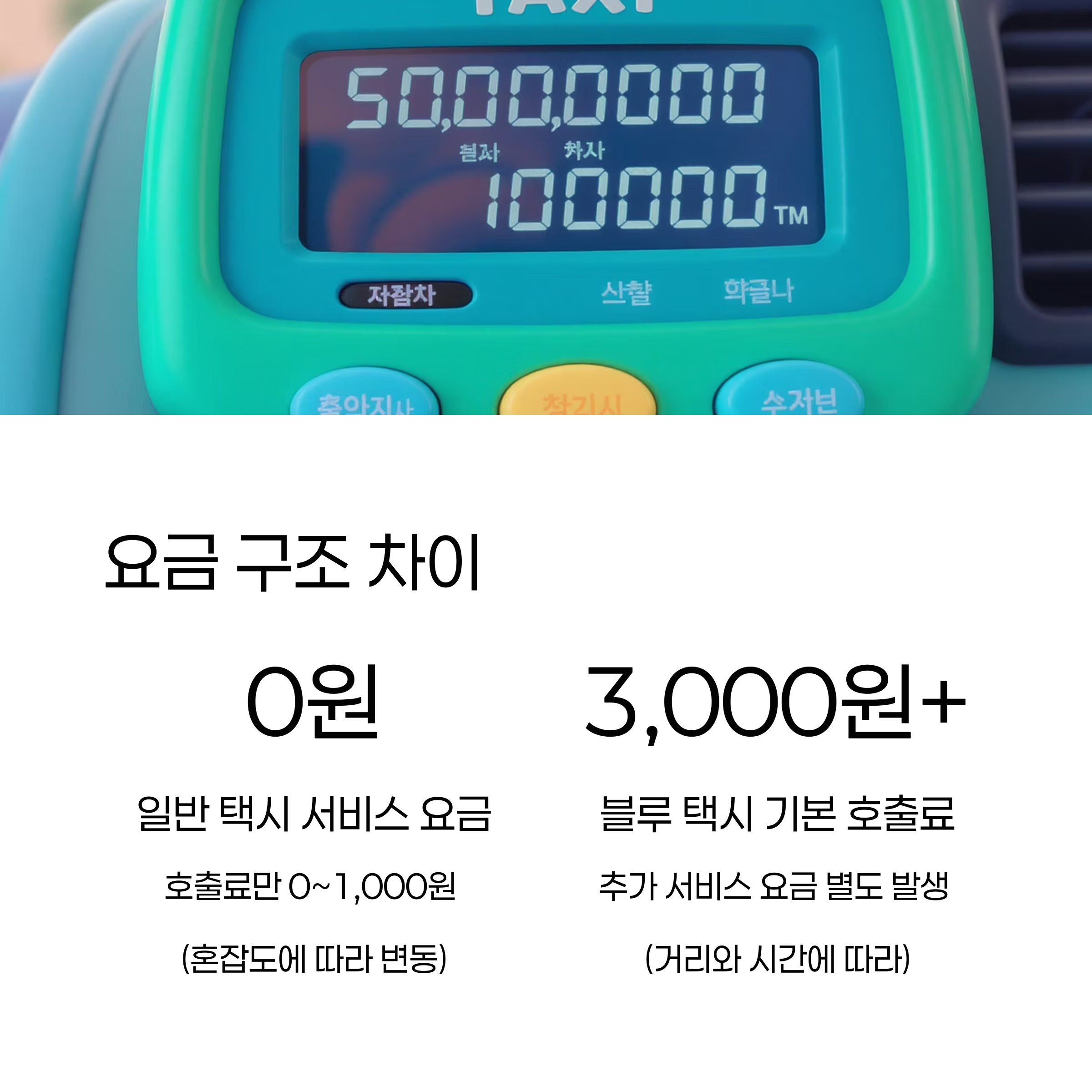 | 앱 호출료 | 0~1,000원 (혼잡도 따라 변동) | 기본 3,000원 (지역별 상이) |