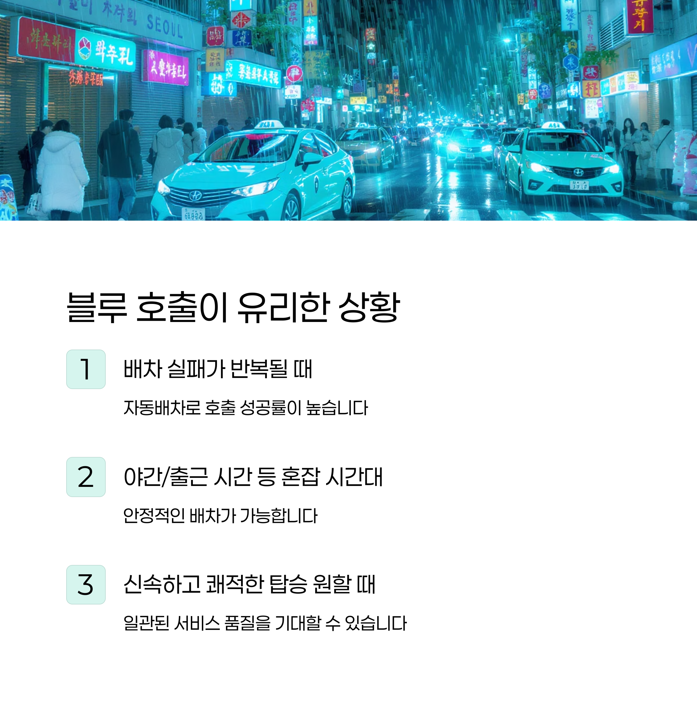 따라서 블루는 호출 성공률이 높고, 빠른 배차가 가능합니다.