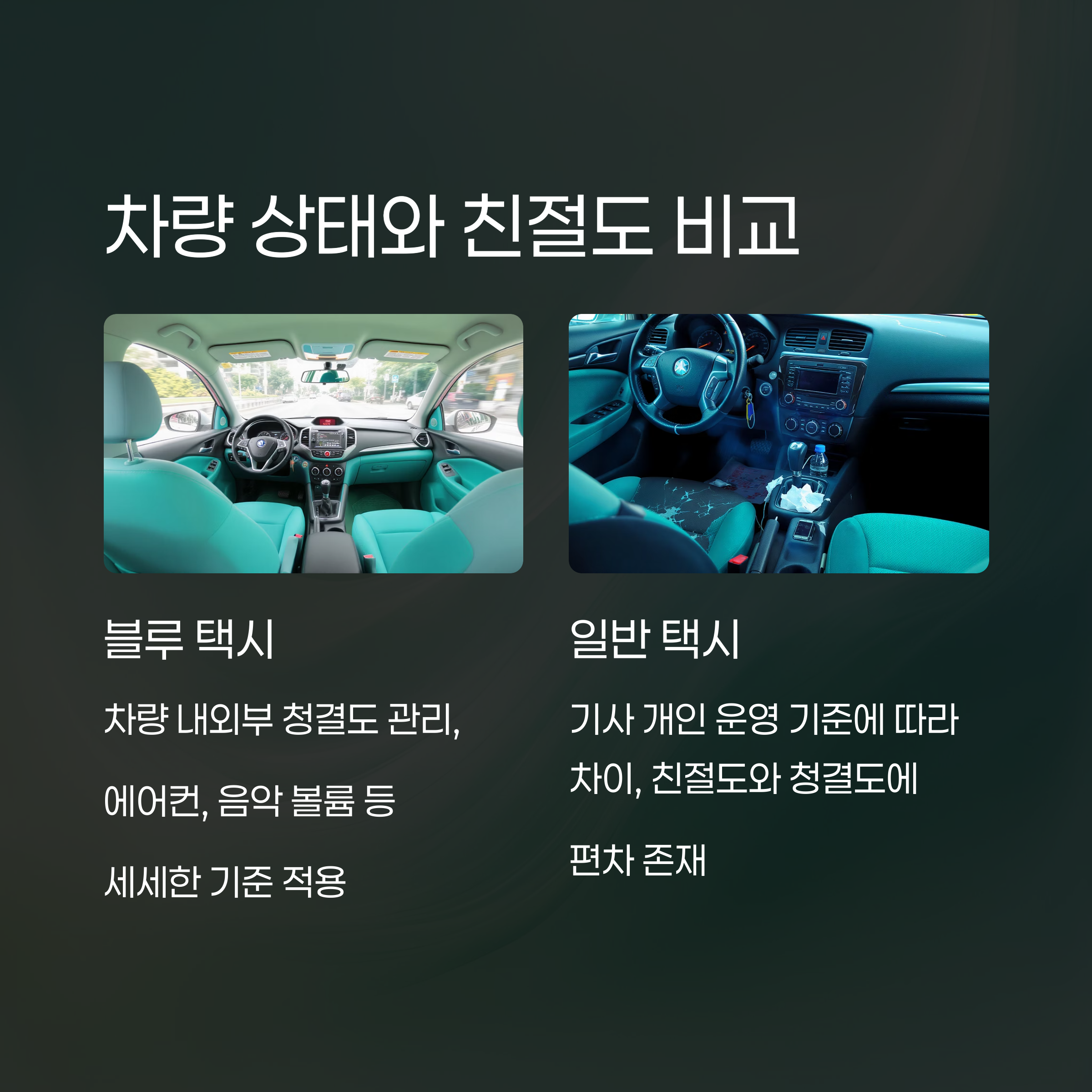 일반 택시는 기사 개인의 운영 기준에 따라 차이가 존재할 수 있으며, 친절도나 청결에 편차가 큽니다.