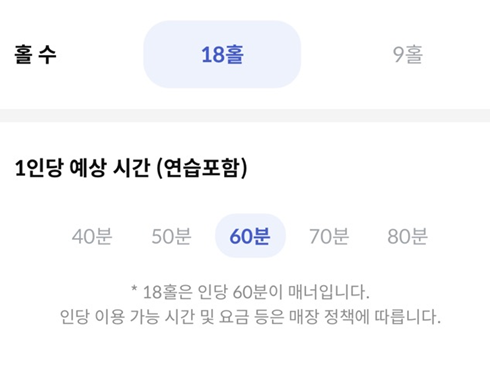 - 18홀 기준 평균 플레이 시간은 1인당 4~60분으로, 시간 조절은 필수입니다.