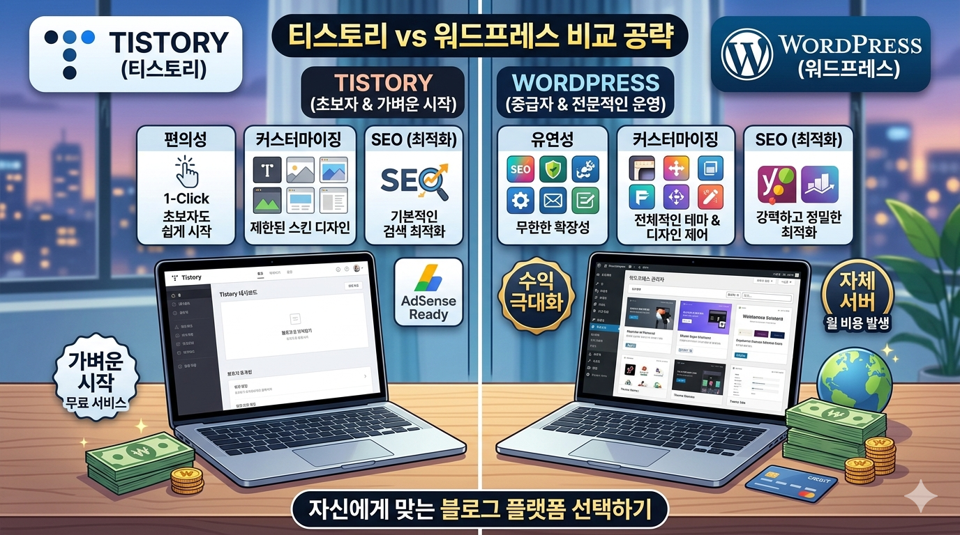 결론적으로 초보라면 티스토리로 감을 잡고, 장기적인 수익형 블로그를 꿈꾼다면 워드프레스를 병행하는 전략을 추천합니다.