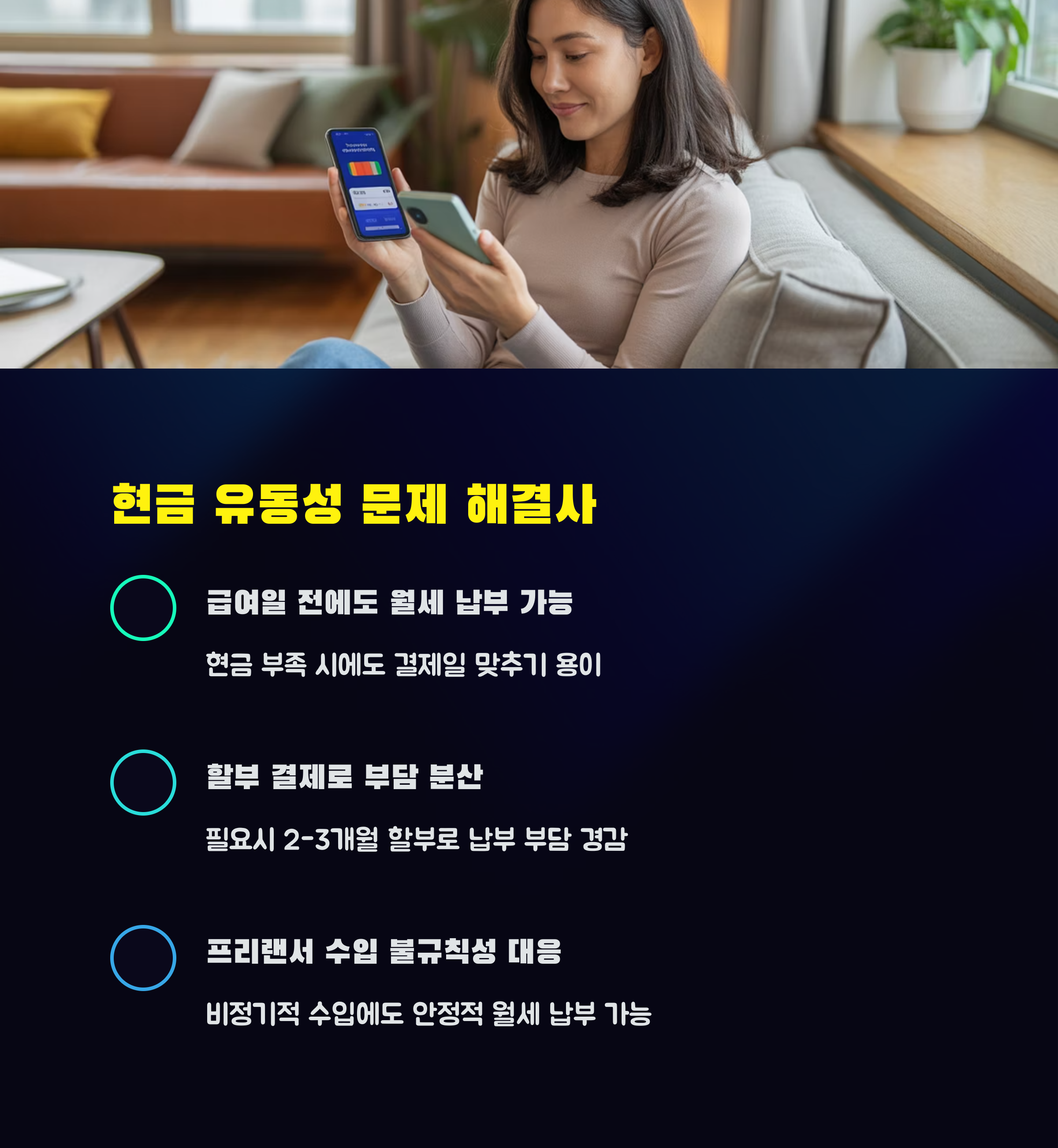 필요할 경우 할부를 통해 월세를 나눠 낼 수도 있으며, 이는 임시 유동성 문제 해결에 효과적입니다.