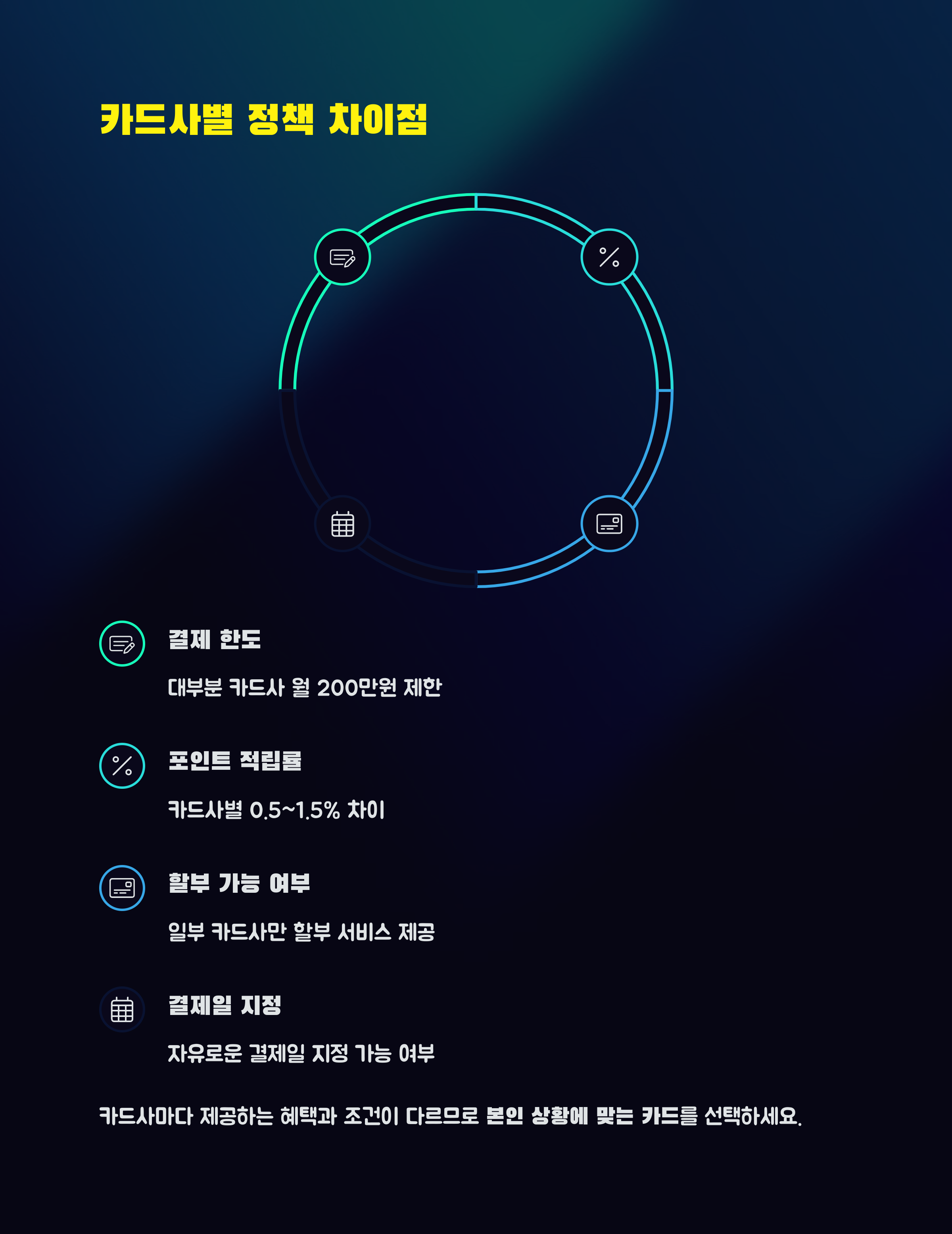 또한 카드사마다 제공하는 기능이 다르므로, 할부 여부, 포인트 적립 등 정책 차이를 사전에 확인해야 합니다.