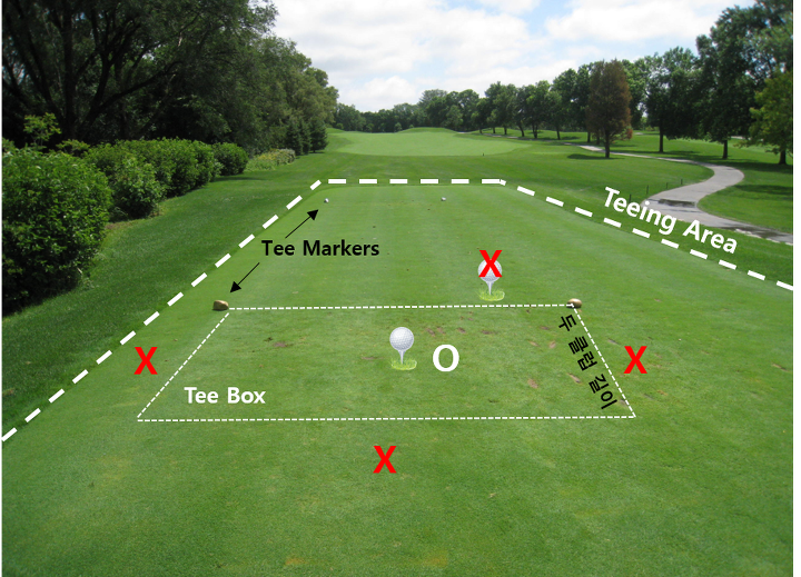 골프공은 반드시 플레이하는 티마커 사이에서 쳐야 하며, 티마커 앞으로 나와 있으면 안 된다. 위 사진처럼, 골프공은 표시된 티 박스 안에 위치해야 하며 (골퍼의 스탠스는 박스 밖에 있어도 된다), 티마커부터 약 두 클럽 길이까지 티업 할 수 있다. 이를 어길 시 2벌타 부과.