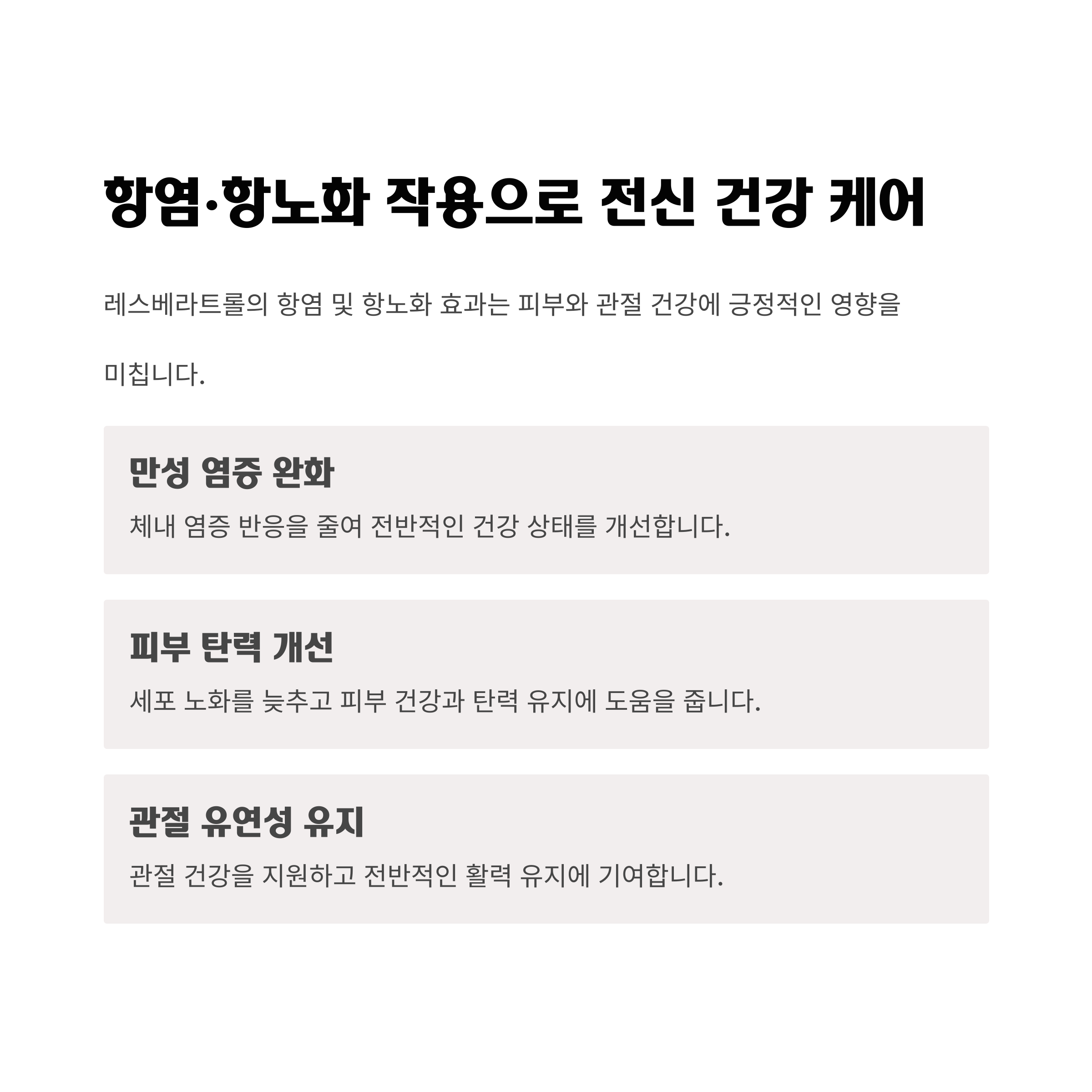 | 레스베라트롤 | 심혈관 건강, 항염, 항노화 |
