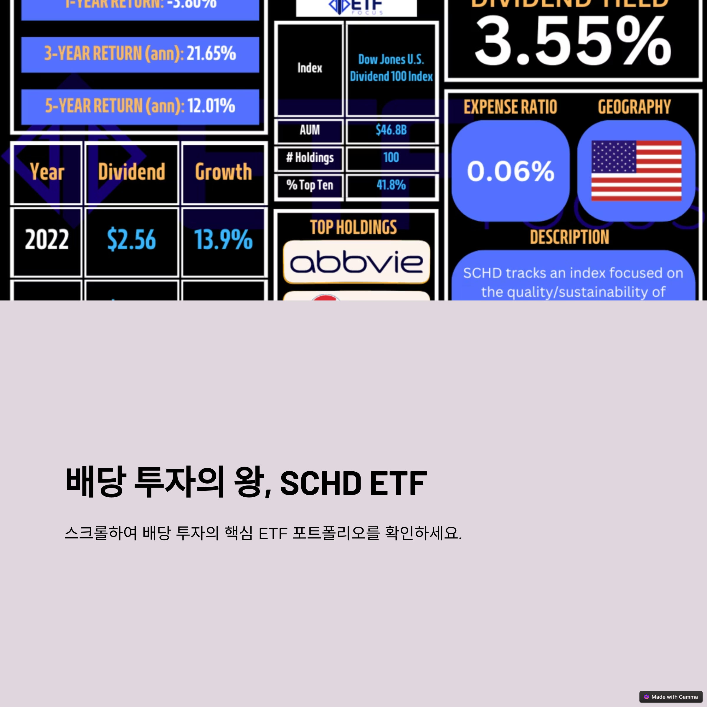배당수익을 중요하게 여기는 투자자라면 SCHD는 절대 빼놓을 수 없습니다.