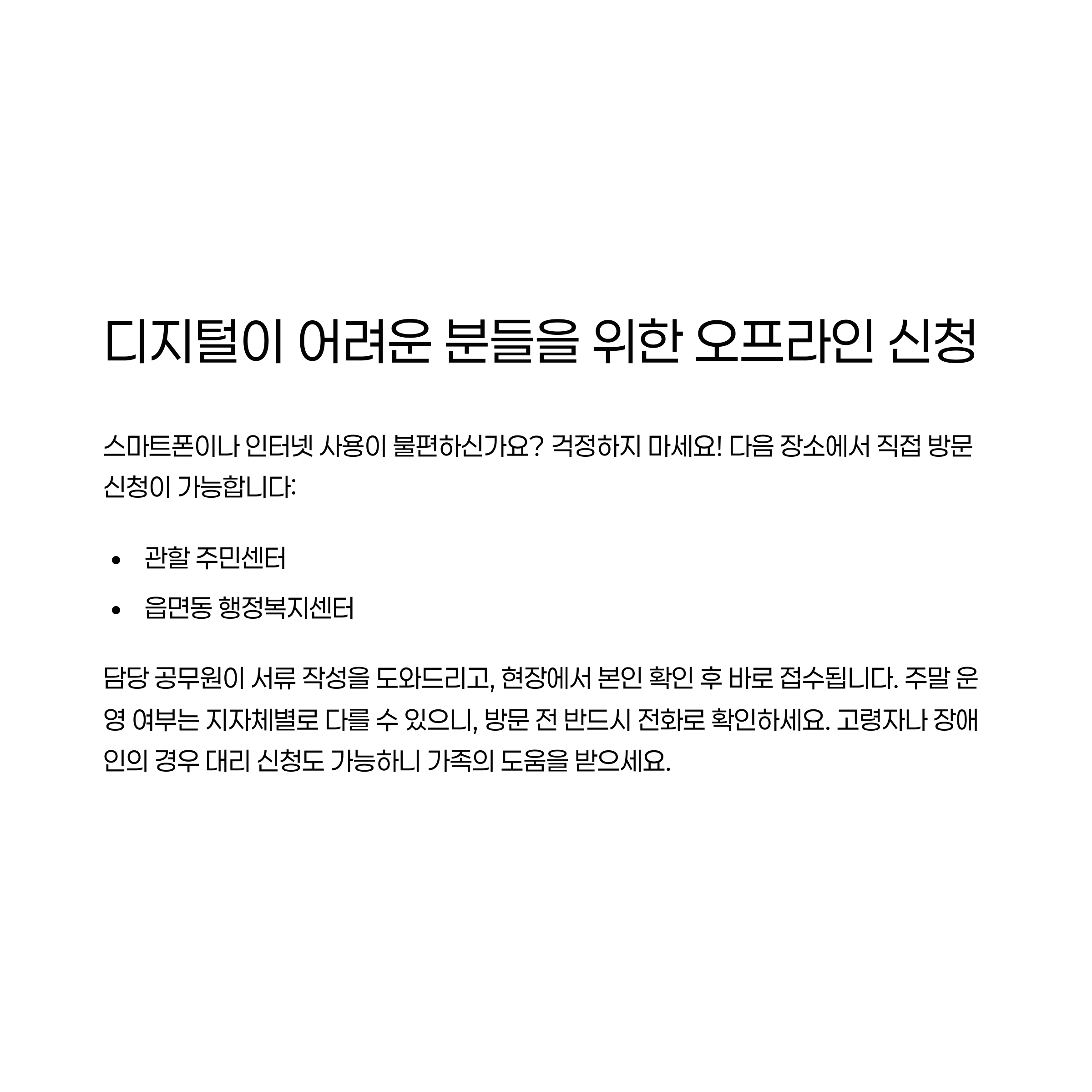 | 65세 이상 | 주민센터 방문 | 대리 신청 가능 |