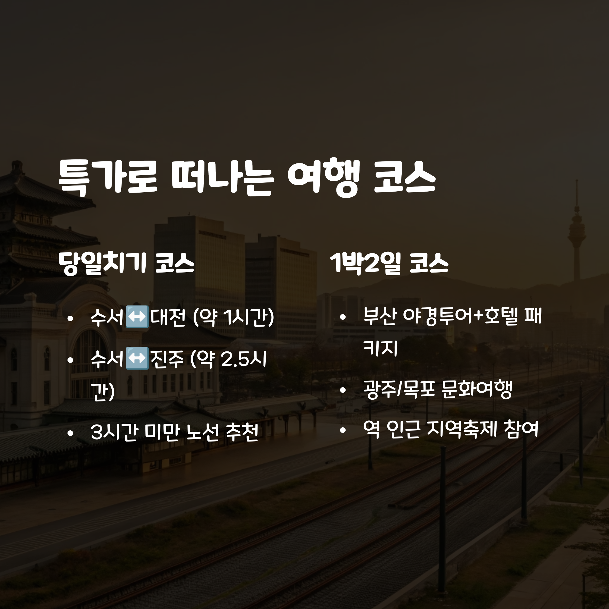 - 당일치기: 수서→부산, 아침 일찍 출발하면 해운대 산책 후 저녁에 복귀 가능!