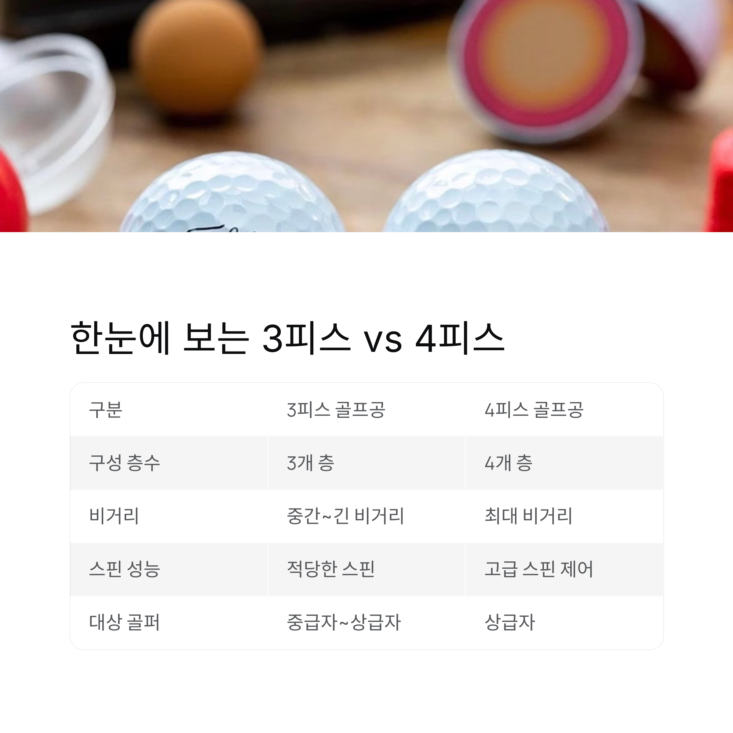 특히 3피스와 4피스 골프공은 중급자 이상 골퍼들이 반드시 알아야 할 중요한 구분 요소입니다.